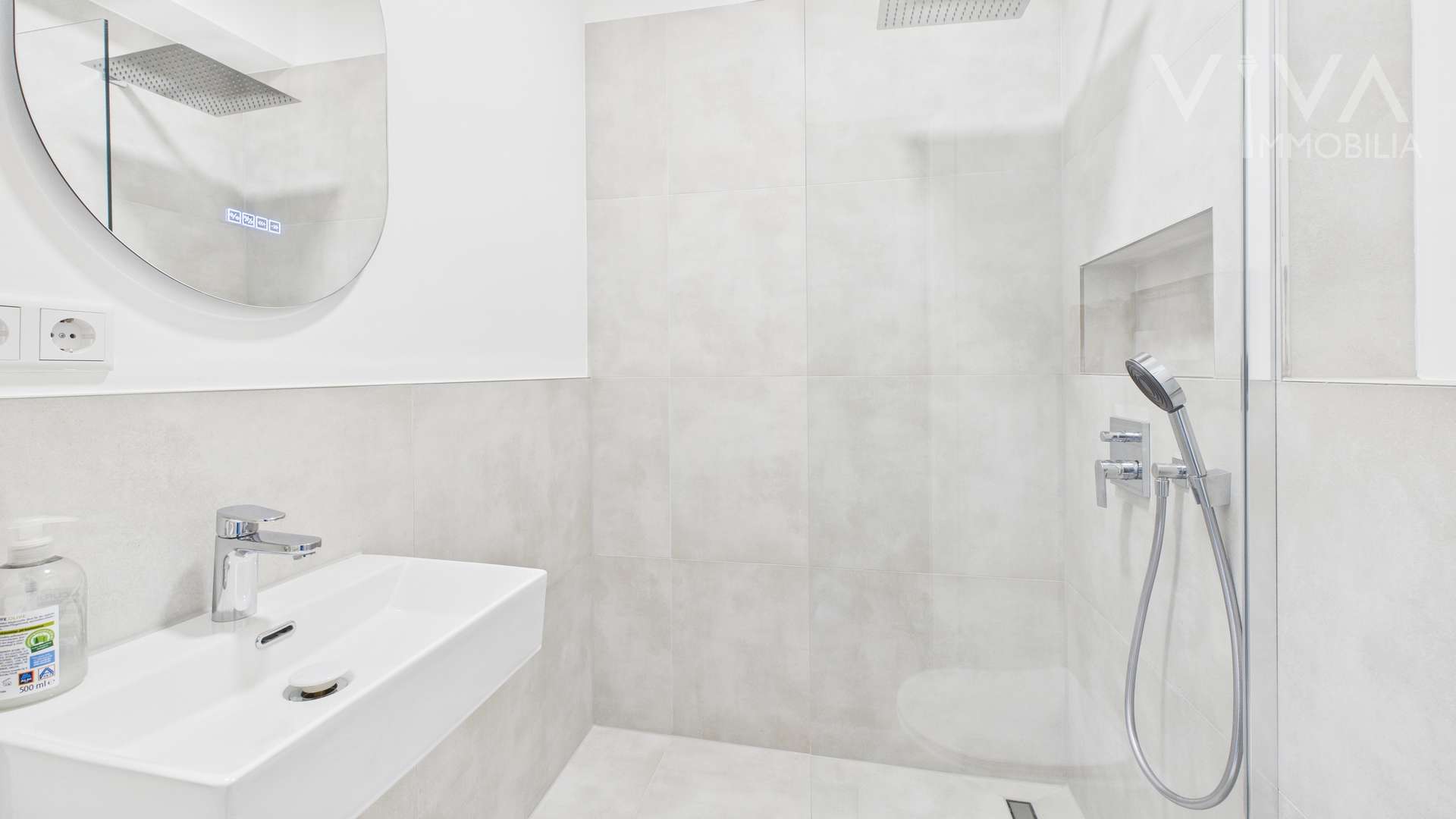 Das modern gestaltete Badezimmer ist mit einer bodentiefen Dusche ausgestattet und besticht durch seine zeitlose Eleganz.