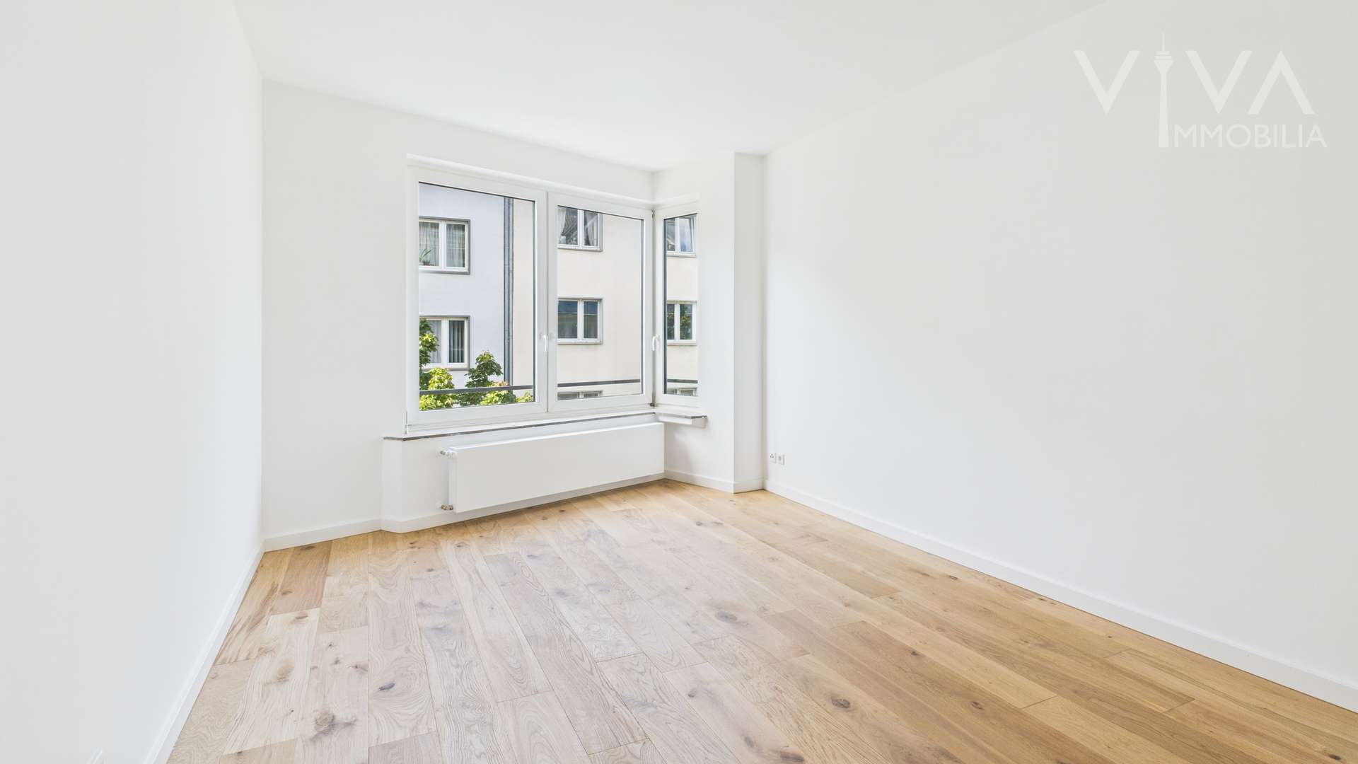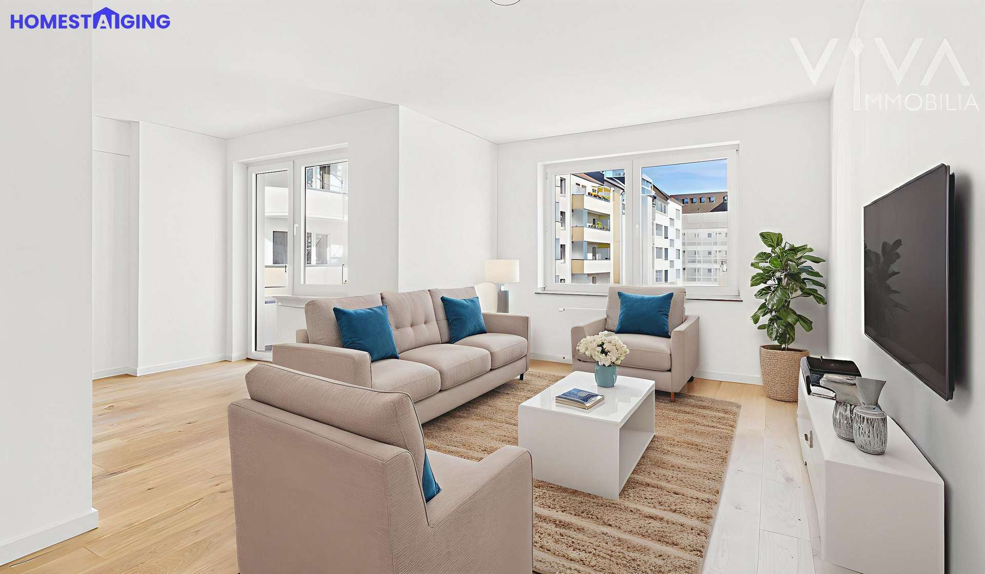 Der helle, große Wohn-Essbereich mit Zugang zur offenen Küche bildet das Herzstück der Wohnung. Von dort aus gelangen Sie auf den attraktiven Balkon mit Blick in den großläufigen Hinterhof.