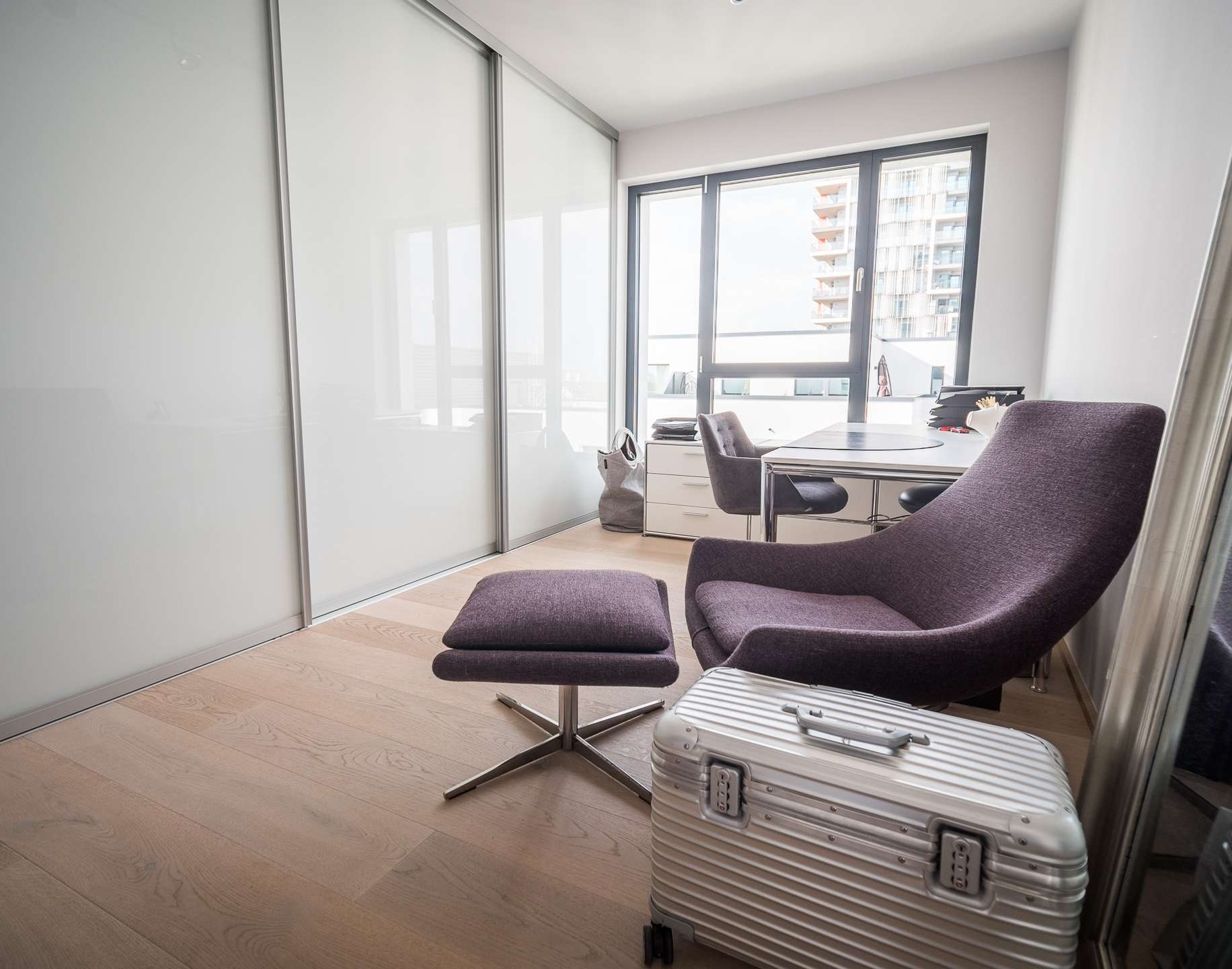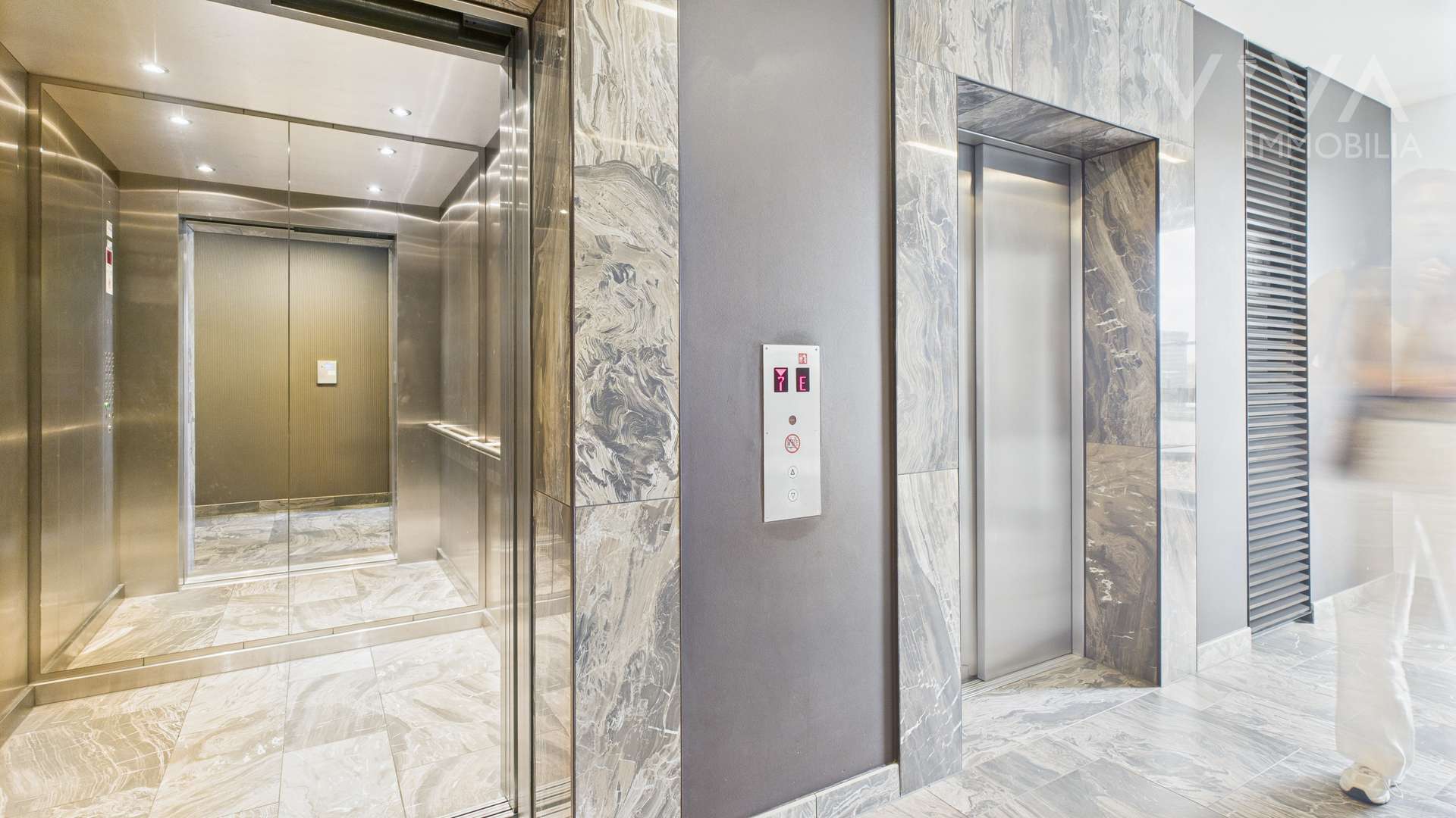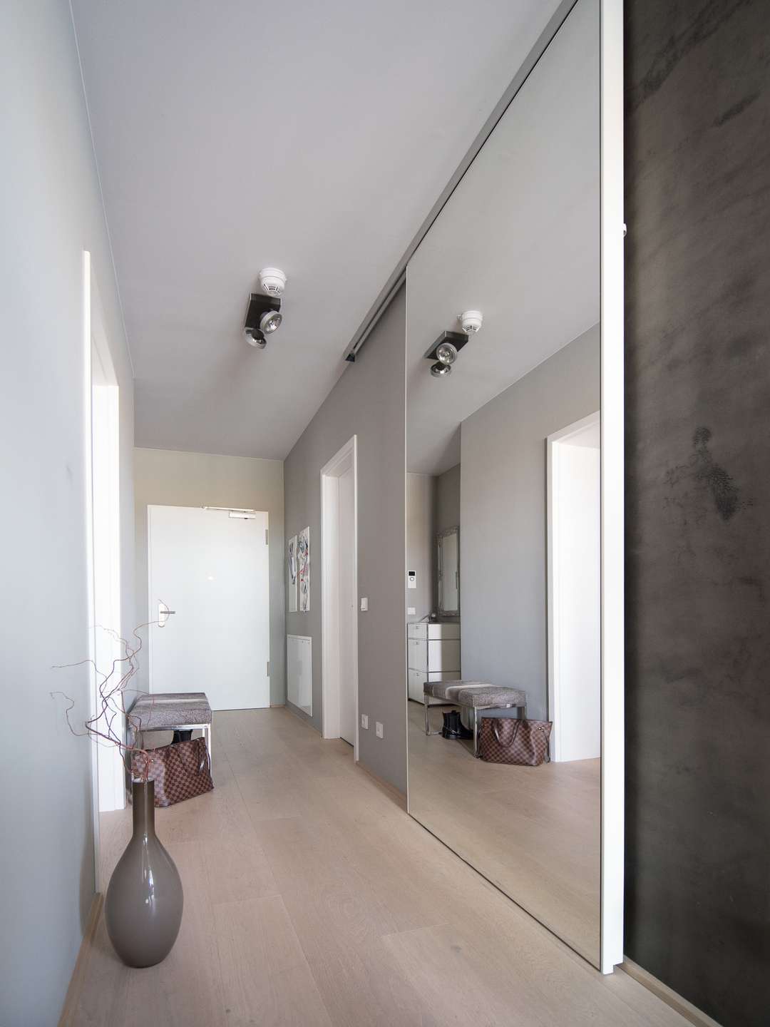 Mit dem großzügigen Aufzug gelangen Sie komfortabel in die 7. Etage, wo Sie eine helle Diele mit maßgefertigtem Spiegel-Einbauschrank empfängt – durchdacht geplant und stilvoll umgesetzt.
