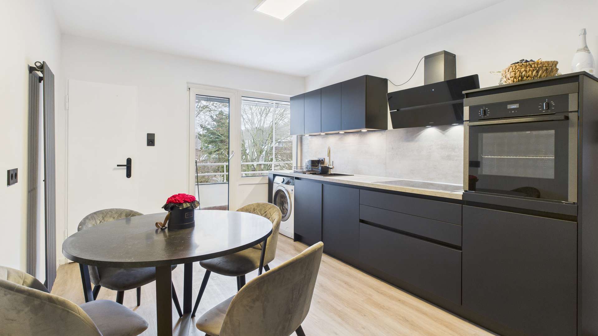 Ein Highlight der Wohnung ist die stylische, moderne Einbauküche mit hochwertigen Neff-Geräten, die keine Wünsche offen lässt und sich harmonisch in das Wohnkonzept einfügt. Ebenso überzeugt der großzügige Balkon, der sowohl vom Wohnzimmer als auch von der Küche aus zugänglich ist und einen herrlichen Ausblick in die weitläufige Natur bildet.
